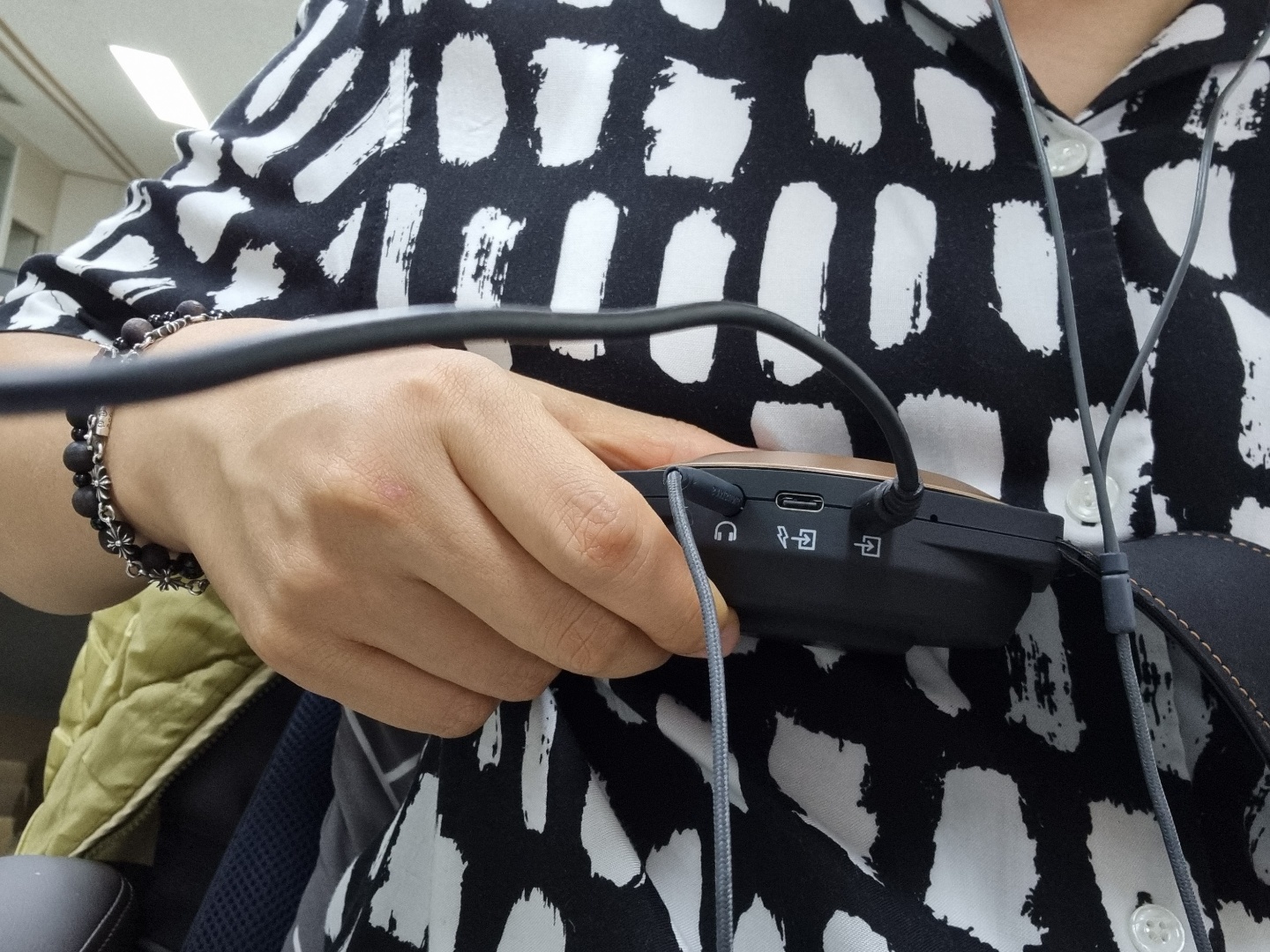 - 이어폰표시에는 이어폰 잭을 연결하고, 저 화살표시에 컴퓨터 연결 케이블에 연결하고 컴퓨터에는 이어폰표시에 연결하면 완료, 내장되어잇는 케이블이 짧아서 다소 불편