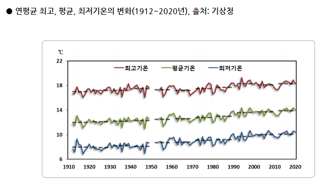 - 기온의 장기적인 변화 추세로 최근 30년(1991∼2020년)은 과거 30년(1912∼1940년)에 비해 연평균기온이 1.6℃ 상승했다. 또 109년간 연평균기온은 10년마다 +0.2℃로 꾸준히 상승하였고, 특히 봄(+0.26℃)과 겨울(+0.24℃)의 기온 상승 경향은 여름과 가을(0.12∼0.17℃)에 비해 뚜렷했다.